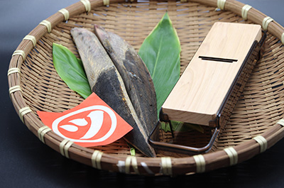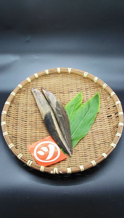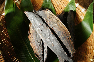 直火式焙乾法で手作りされた荒本節の表面の皮、タール分を磨いた節の雄節と雌節のセットです。